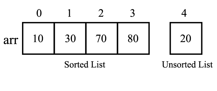 Langkah 4. Langkah terakhir adalah memasukkan data pada index 4 di unsorted list ke dalam sorted list. Setelah dibandingkan, nilai pada data index 4 lebih kecil ketimbang nilai data pada index 1 sampai 3. Hasilnya, data index 4 akan diposisikan ke index 2 dan data setelahnya akan bergerak mundur. Maka, hasilnya akan seperti gambar di bawah ini: